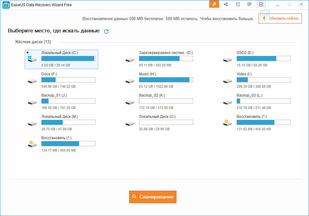 Давайте перейдём к самому главному. На главном экране приложения мы выбираем диск, на котором следует выполнить поиск данных для восстановления, и нажимаем кнопку Сканирование.