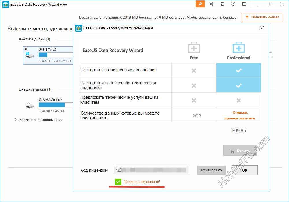 - В результате последует уведомление о том, что EaseUS Data Recovery Wizard из версии Free превратилась в Professional.