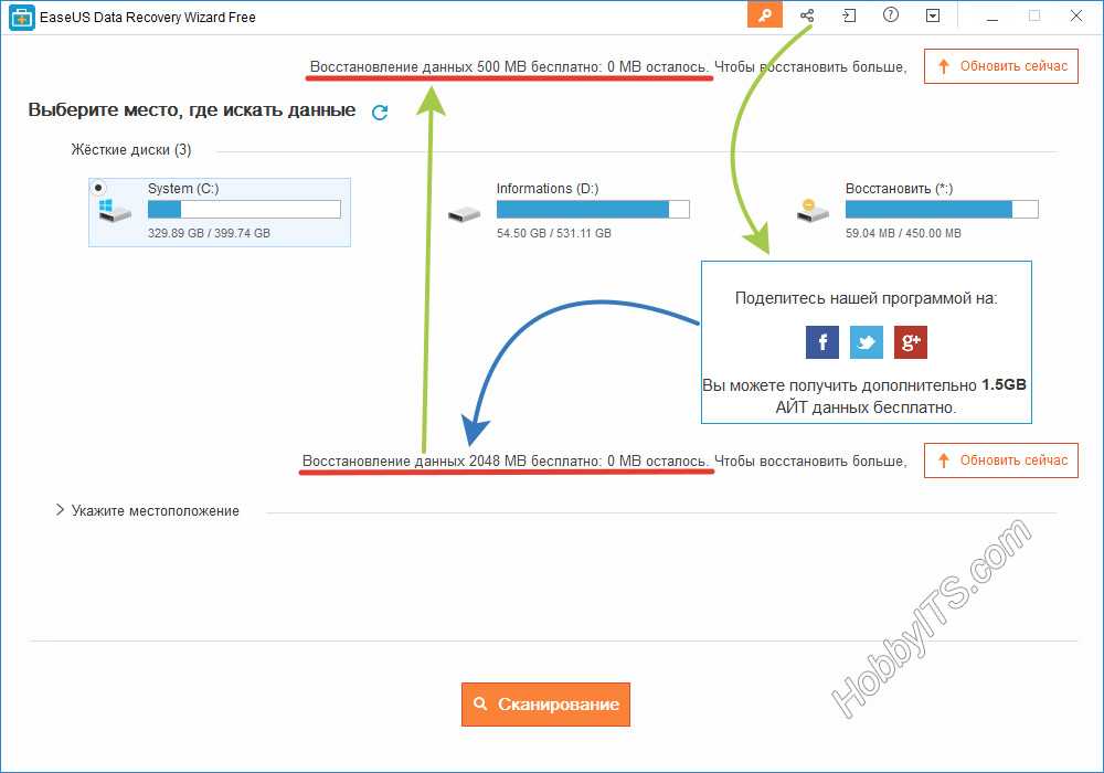 Самое главное я отметил на изображении выше красным — это объем данных, который можно восстановить. Видим, что в бесплатной всего 2 Гб, и то, как сказано на сайте, это если поделиться ссылкой на программу, иначе будет доступно лишь 500 мб.: