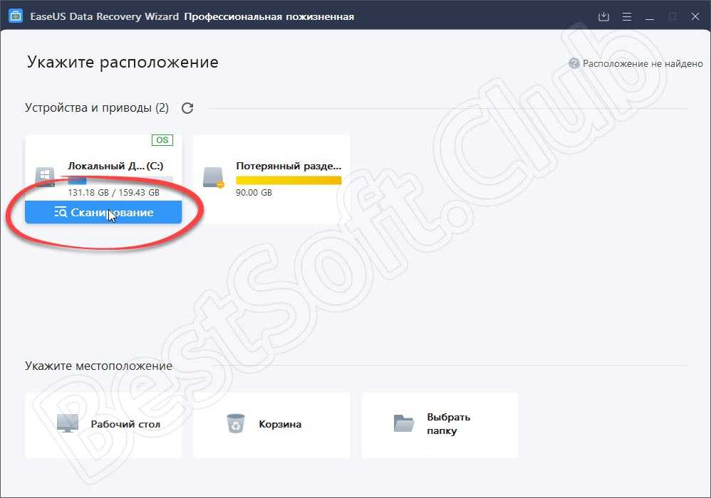 В главном окне нужно выбрать место, где следует искать удаленные данные. Здесь отображаются все диски, подключенные, в данный момент времени, к компьютеру.