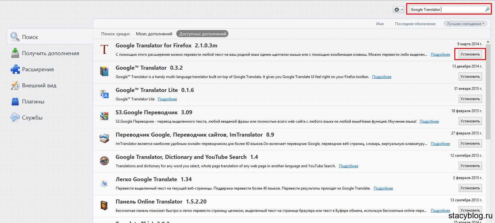 3. Браузер нашел различные расширения. Выбираем Google Translator for Firefox 2.1.03 и нажимаем «Установить».
