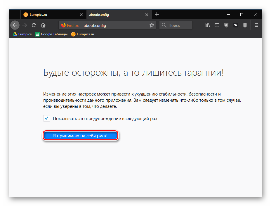 2) Введите в адресную строку about:config и нажмите Enter. В появившемся сообщении кликните по кнопке «Я обещаю, что буду осторожен!»;