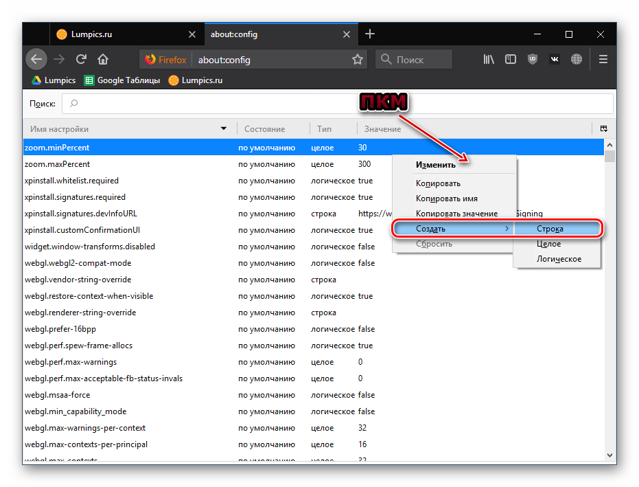 10) Вновь вернитесь на страницу about:config. Щёлкните мышкой на пустом месте и в контекстном меню выберите «Создать»->»Строка»;