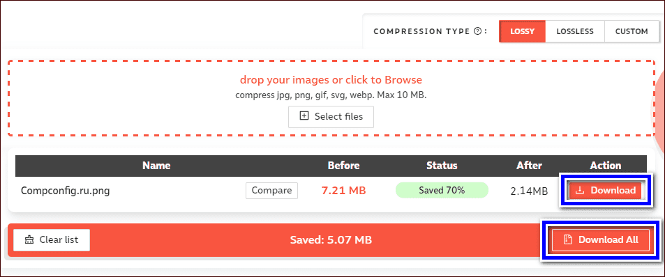 3. Сервис покажет результат. Щелкните по кнопке «Скачать сжатые изображения» для сохранения.