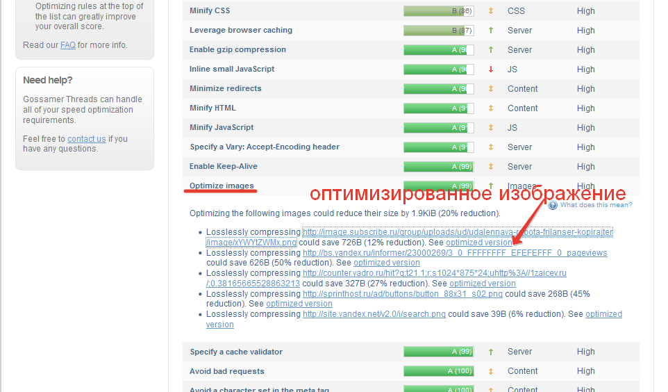 Кстати, если вы видите что необходимо оптимизировать изображения счётчиков или баннеров, которые загружаются со сторонних сайтов, то вам нет смысла оптимизировать такие изображения. Если вы конечно не хотите загрузить это изображения к себе на хостинг и переписать пути к ним в исходном коде.