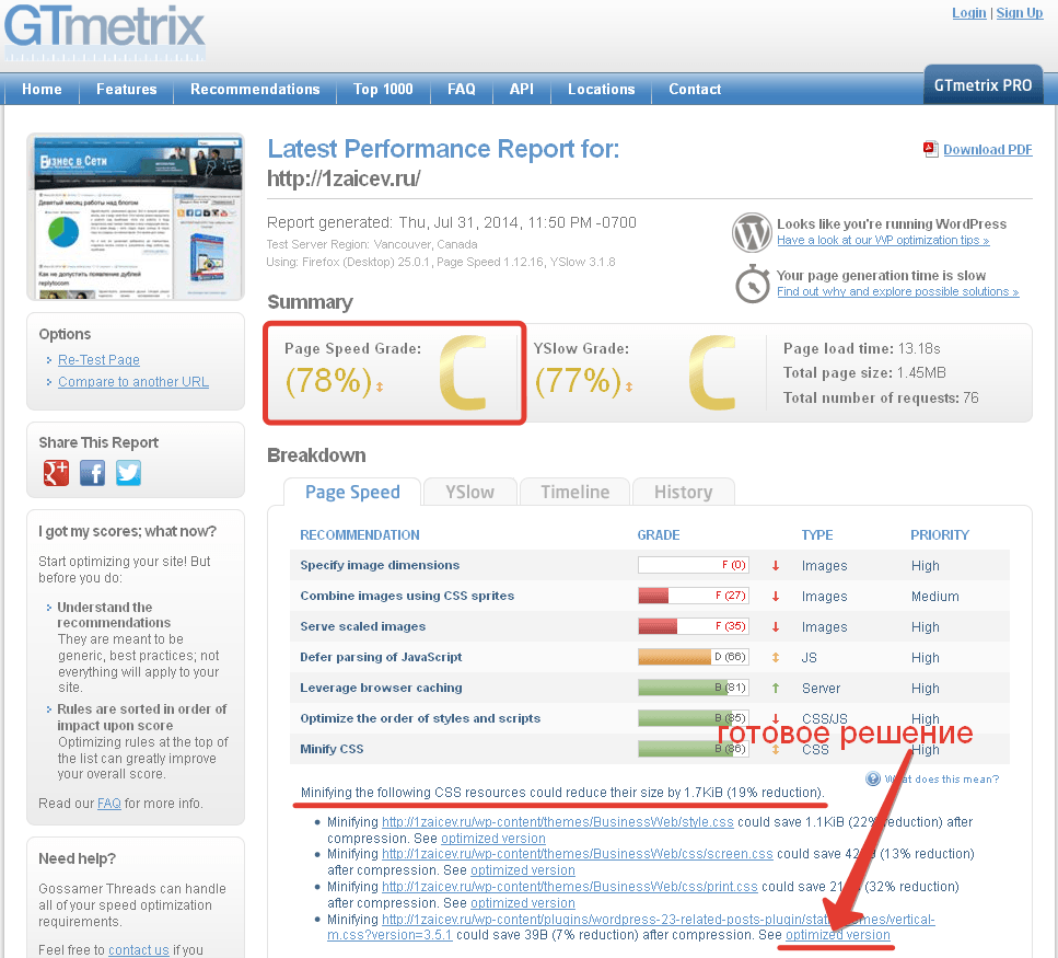 GTmetrix – этот сервис аналогичен Гугловскому, также проводит анализ сайта и выдаёт причины снижающие скорость загрузки сайта. Показатель скорости загрузки выражается в зарубежной системе оценки (где, А – высшая оценка). Плюс сервиса – наличие готовых решений (не на все причины конечно). Минус – отсутствие русского языка (хотя это сомнительный минус).