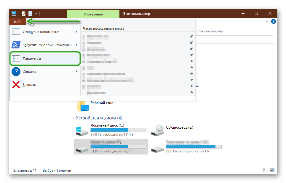 - Откройте Проводник и в правом верхнем углу нажмите «Файл»/«
