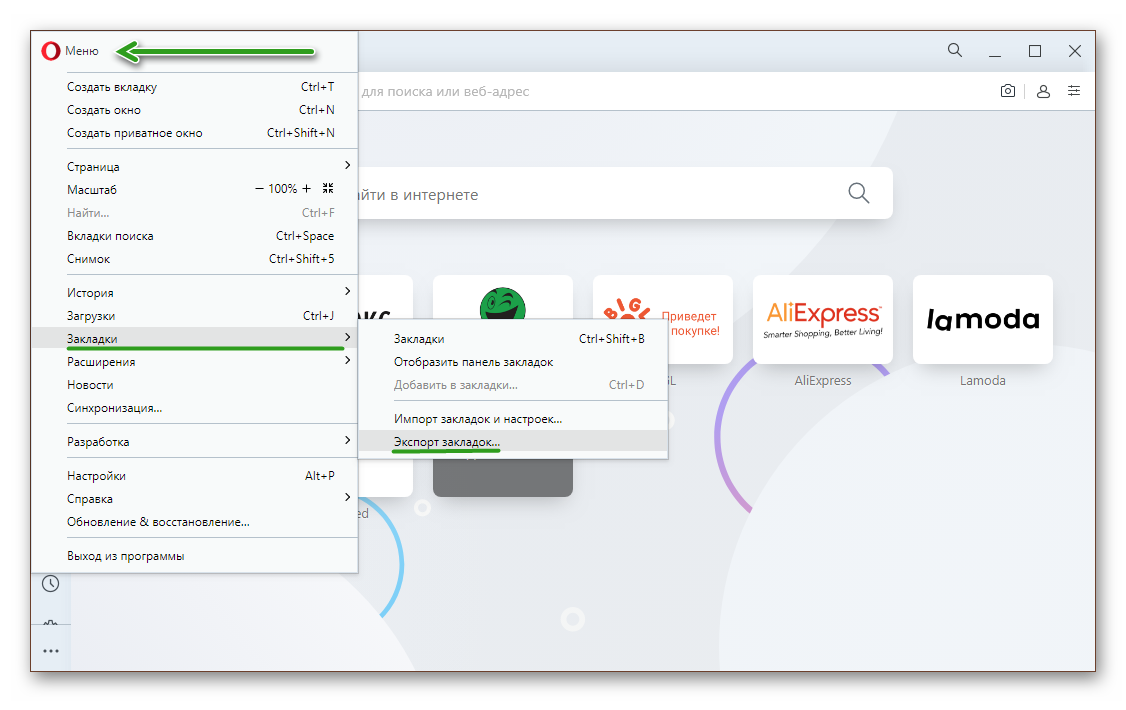 - В открывшемся окне выберите «Закладки»/«Экспорт закладок».