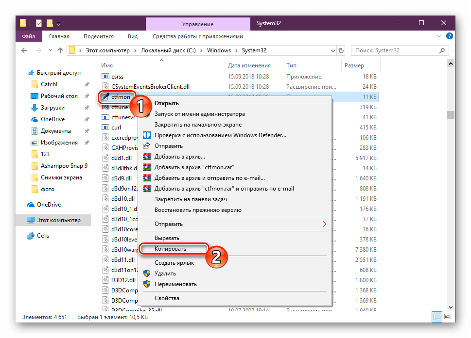 - Снова откройте каталог с ctfmon.exe, щелкните правой кнопкой мыши по этому объекту и выберите «Копировать».