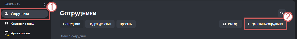 Шаг 1. Заходим в панель администратора на Яндекс 360 и переходим в раздел «Сотрудники». Далее, нажимаем на кнопку «Добавить сотрудника»