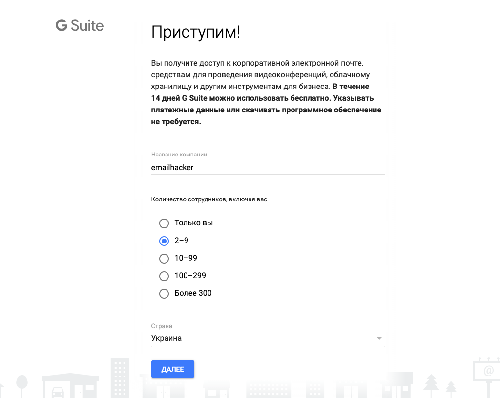 Затем введите имя компании, укажите количество сотрудников и страну.