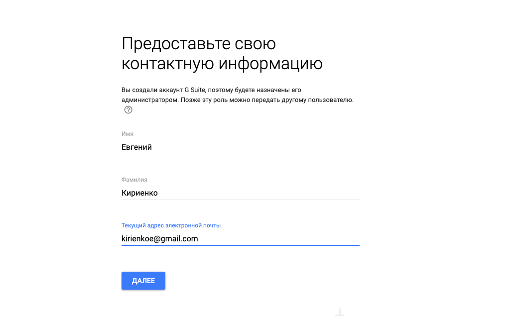 Заполните контактную информацию. Укажите имя и действующий адрес почты в Gmail.