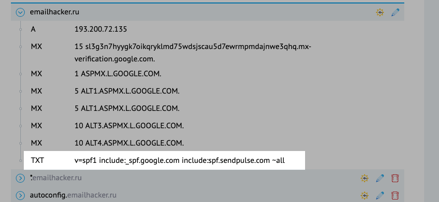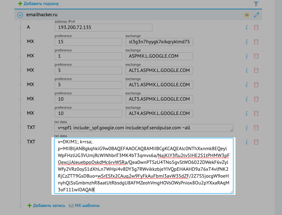 В DNS-панели вашего домена создайте TXT-запись с такими значениями: v=spf1 include:_spf.google.com ~all. А чтобы использовать этот домен для отправки рассылок в SendPulse, SPF-запись должна быть в таком виде: v=spf1 include:_spf.google.com include:spf.sendpulse.com ~all.