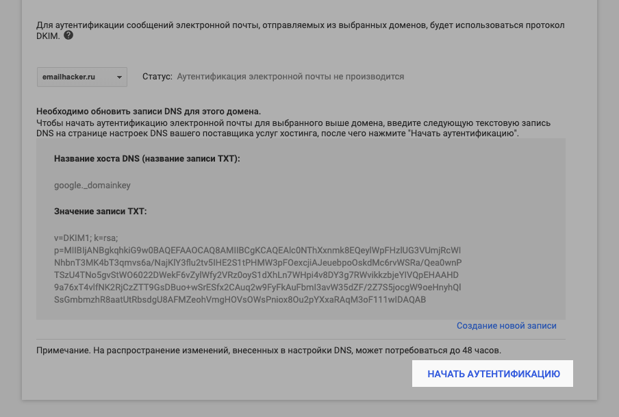 Создание новой DKIM-записи в Google Suite