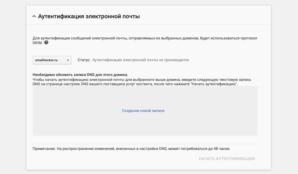 В консоли администратора G Suite перейдите по разделам «Приложения» → G Suite → Gmail → «Аутентификация электронной почты». Выберите домен и нажмите «Создание новой записи».