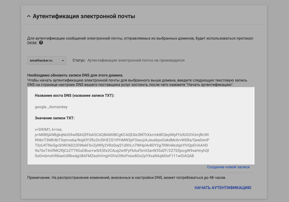 Добавление DKIM-записи Google Suite в DNS-панель домена