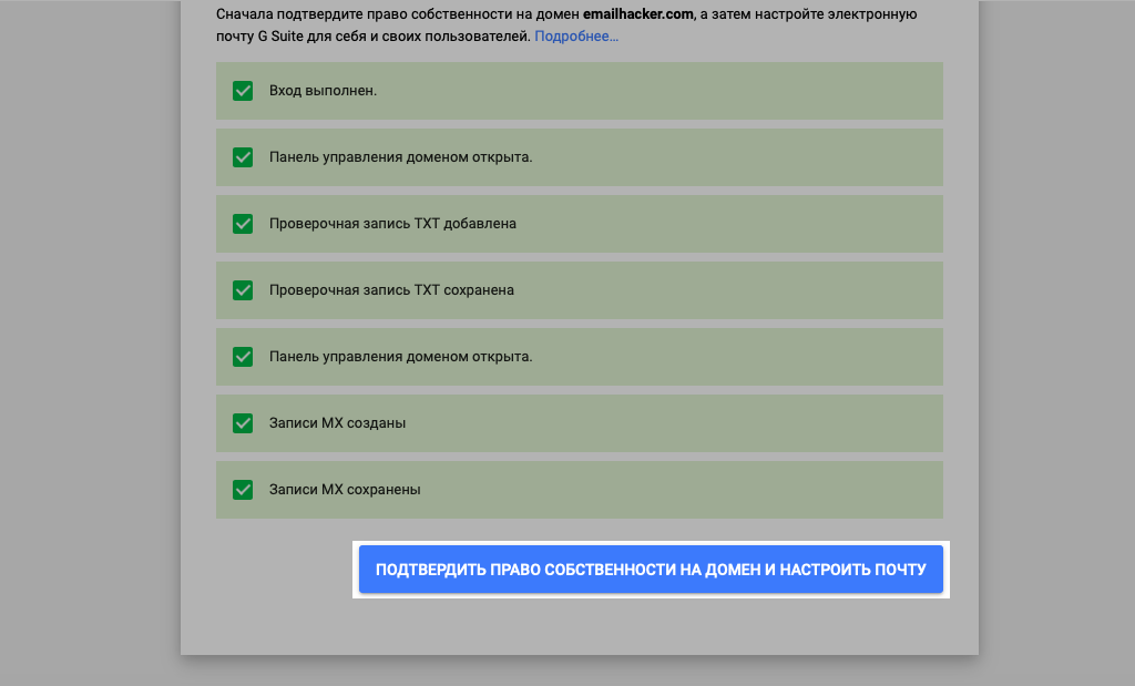 Сохраните добавленные МХ-записи в DNS-панели вашего домена и нажмите «Подтвердить право собственности на домен и настроить почту» в панели подтверждения домена в Google Suite.