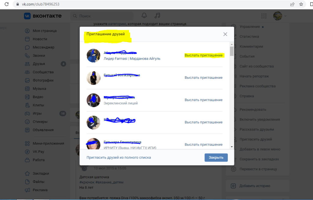 Разослать приглашения в группу