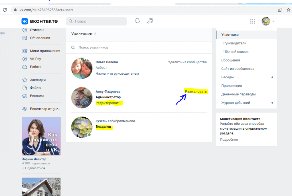 Предусмотрена возможность назначать руководителей, высылать приглашения, заносить посетителей в черный список. Доступны и кнопки для корректировки списка участников: если выбрать пункт меню «Участники», а после нажать на кнопку «Удалить из сообщества» и подтвердить действие во всплывающем окне, то пользователям предстоит заново подписываться или же оформлять заявку на вступление, если сообщество закрытое.