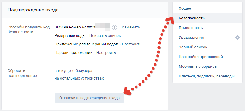 Перейдите в раздел «Безопасность» и нажмите «Отключить подтверждение входа»: