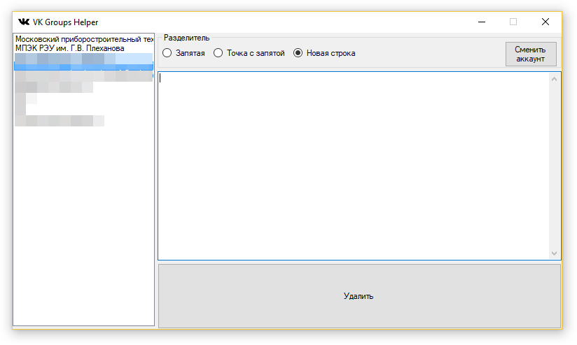 После того как список готов, скопируйте его весь и вставьте в окно программы (не забудьте проверить, что слева выбрана нужная группа!), проверьте что включена вверху функция «Новая строка» (это разделитесь ID в вашем списке) и нажмите «Удалить».