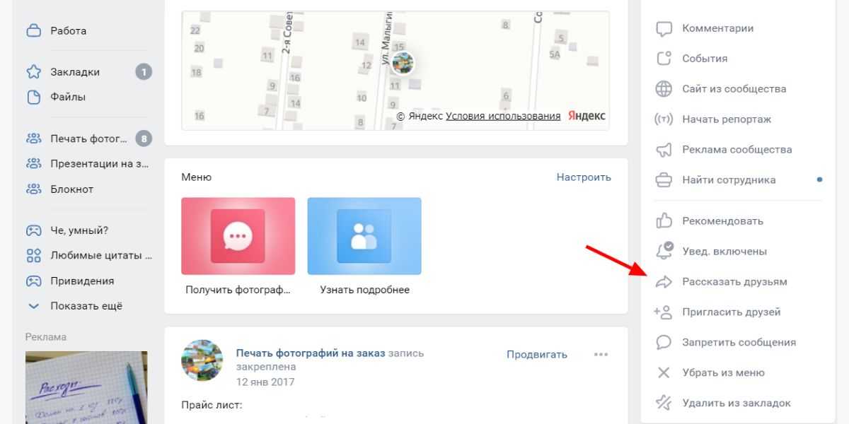 В каждом сообществе есть возможность рассказать о нем вашим друзьям и подписчикам, сразу всем. Нужная кнопка находится в меню справа, рядом с кнопками «Рекомендовать» и «Пригласить друзей».