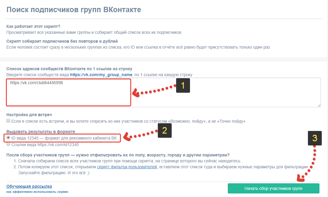 Теперь на той же странице (если вдруг после входа в ВК у вас открылась другая) вставьте скопированный адрес группы , выберите пункт «ID вида 12345» и нажмите «Начать сбор участников групп» .