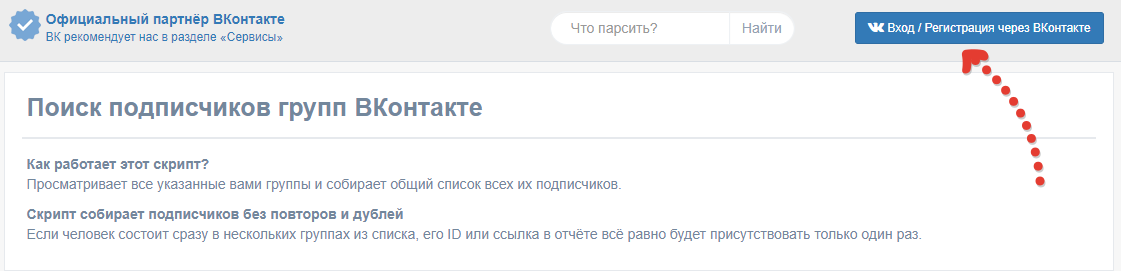 Теперь в том сервисе заходим в свой аккаунт ВКонтакте, нажав «Вход / Регистрация через ВКонтакте»: