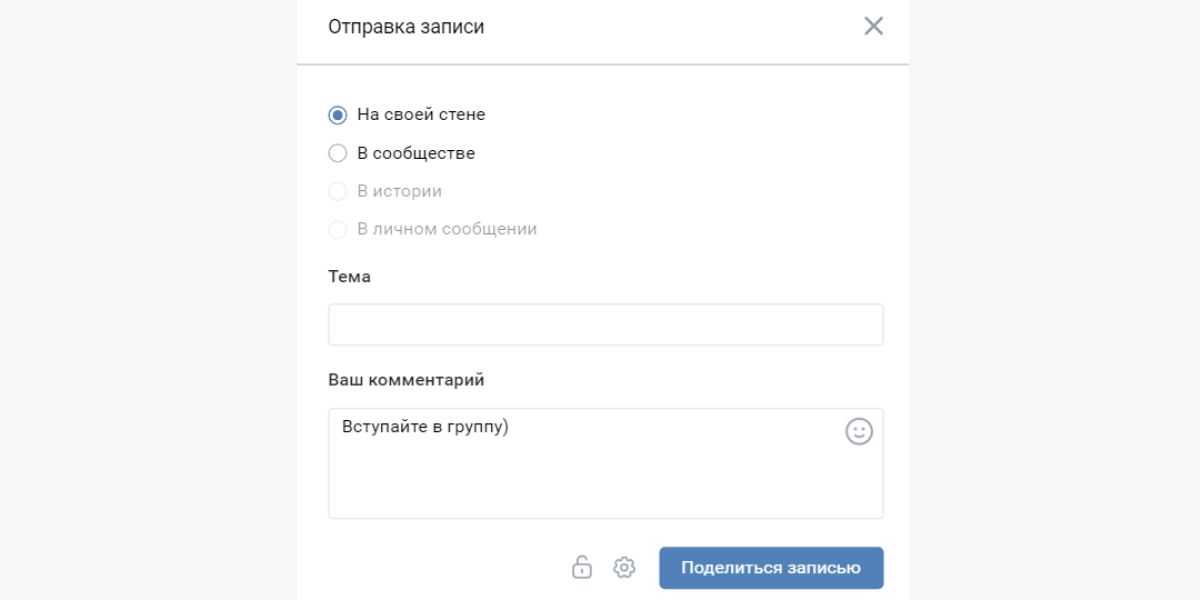 Запись можно разместить на своей стене или отправить личным сообщением, а также опубликовать в другом сообществе, где вы являетесь админом, и прикрепить к ней фото, видео или другие материалы.