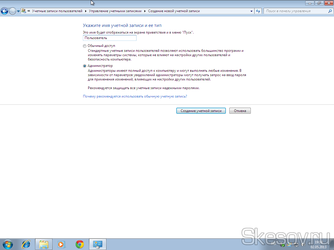 3) Далее необходимо создать нового пользователя с правами администратора. Для этого идем в «Панель управления» → «Учетные записи пользователей» → «Добавление и удаление учетных записей пользователей» → «Создание учетной записи». Вписываем любое имя, выбираем «Администратор» и жмем «Создание учетной записи»:
