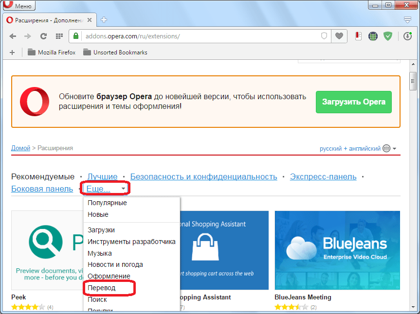 - Магазин Опера предложит несколько альтернативных переводчиков, которые можно установить в браузере. Выберите оптимальное расширение по своему усмотрению.