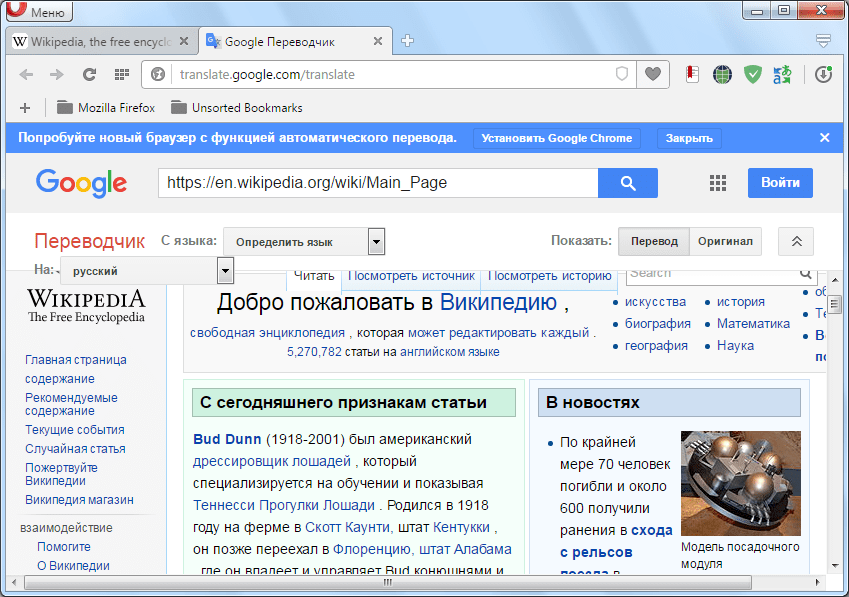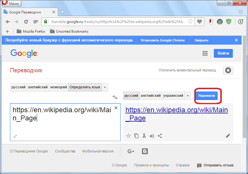 После этого выполняется перевод страницы. Аналогичным образом переводятся страницы через браузер Опера и на других онлайн-сервисах.