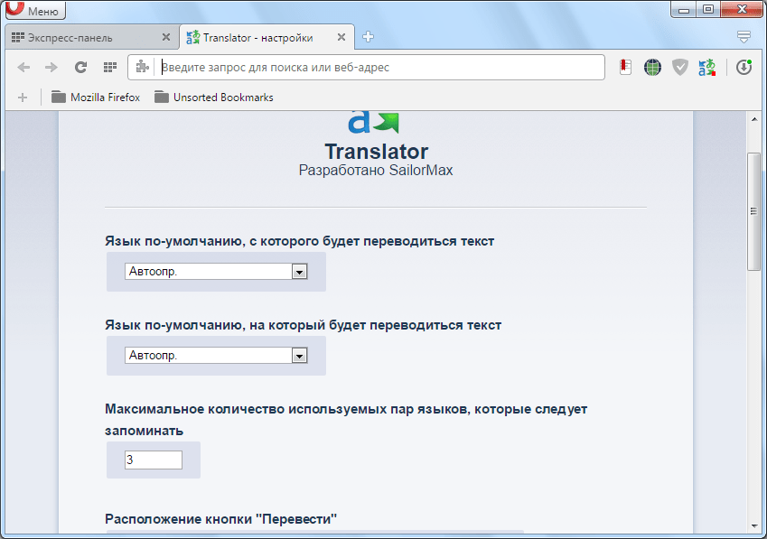После этого мы переходим на страницу, где можно произвести более точные настройки дополнения. Тут можно указать, с какого языка, и на какой будет переводиться текст. По умолчанию выставлено автоопределение. Лучше всего оставить этот параметр без изменений. Тут же в настройках можно изменить место расположения кнопки «Перевести» в окне дополнения, указать максимальное количество используемых пар языков и произвести некоторые другие изменения конфигурации.
