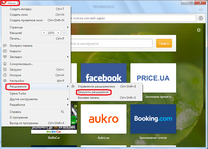 Для того чтобы установить нужное расширение, переходим в меню браузера, выбираем пункт «Расширения», а затем кликаем по надписи «Загрузить расширения».