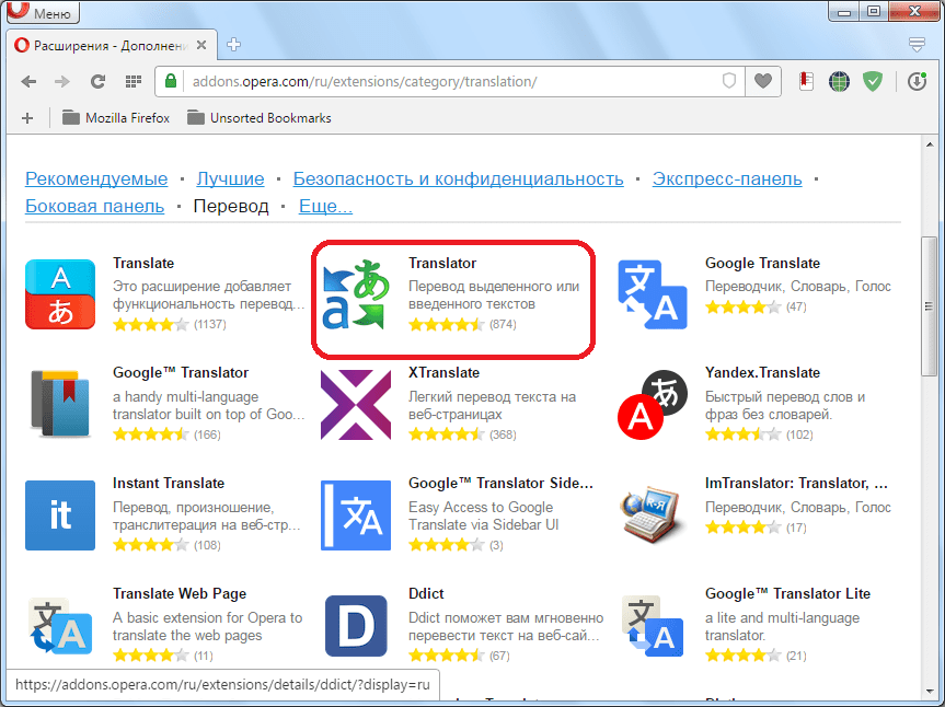Рассмотрим, как перевести страницу с текстом на иностранном языке на примере популярного дополнения Translator. Для этого переходим на соответствующую страницу в разделе «Перевод».