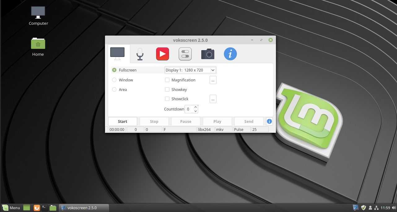 Vokoscreen имеет пользовательский интерфейс с пятью вкладками: