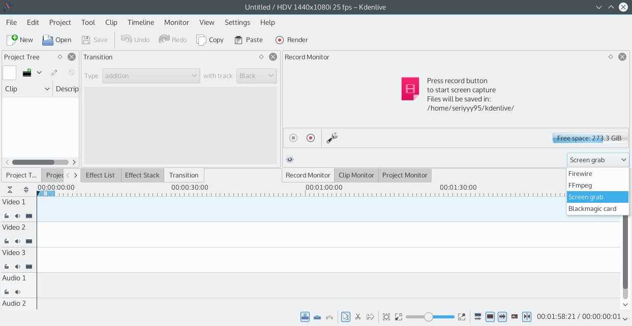 Начнем с kdenlive. Установить можно с официальных репозиториев. При первом запуске программа проверит, установлены ли все необходимые компоненты и попросит указать некоторые настройки. Дальше, чтобы выполнить запись экрана KDE, на вкладке Record Monitor в нижнем правом углу выберите ScreenGrab и нажмите кнопку записи: