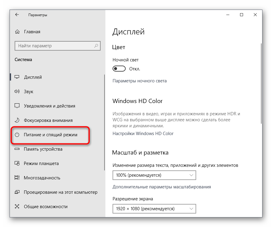 Дальше необходимо перейти к разделу «питание и спящий режим». Именно там будет проводиться вся настройка электропитания.
