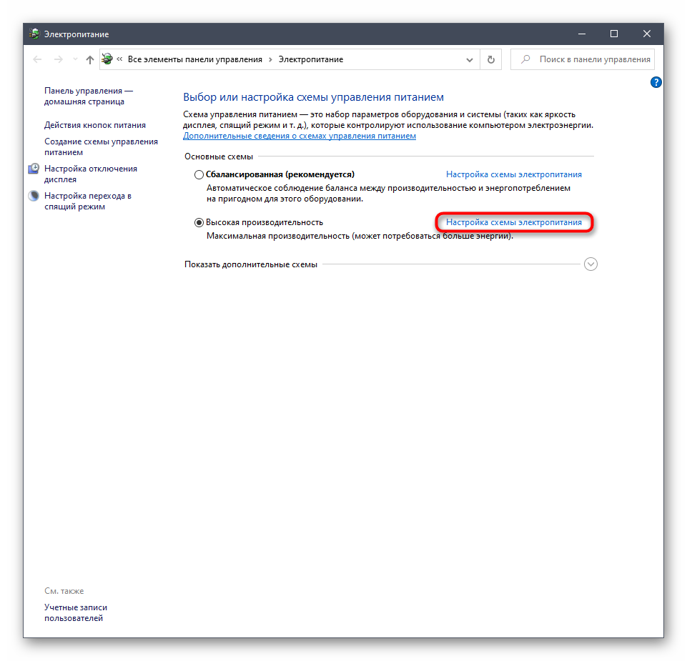 Для выбора данной схемы электропитания необходимо выбрать пункт «Высокая производительность». Для детальной настройки необходимо выбрать «Настройка плана электропитания».