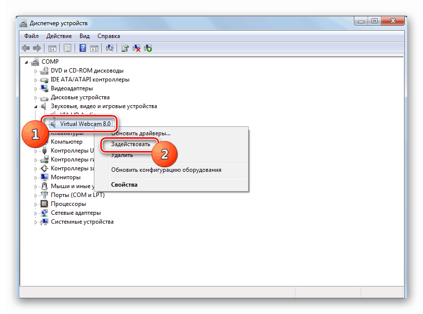 В открывшемся списке устройств отыщите наименование видеокамеры, которую требуется подключить, и щелкните по её названию правой кнопкой мышки. Присутствие пункта «Задействовать» в отобразившемся меню означает, что камера отключена. В этом случае требуется кликнуть по нему.