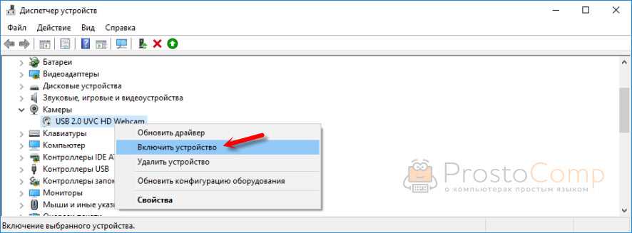 У меня это устройство USB 2.0 UVC HD WebCam. Если у вас есть похожее устройство на одной из этих вкладок, то все должно работать. Если возле камеры есть значок в виде стрелки, то ее нужно «Задействовать» (включить устройство) нажав на нее правой кнопкой мыши. После этого камера будет доступна в системе.