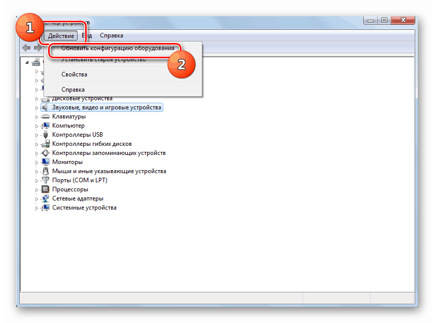 Если вы не найдете в «Диспетчере устройств» название видеокамеры, а такое иногда бывает, потребуется дополнительно произвести обновление конфигурации устройств.