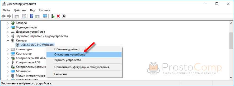 Кстати, это самый просто и надежный способ полностью отключить веб камеру ноутбука. Просто нажимаем на нее правой кнопкой мыши и выбираем «Отключить устройство».