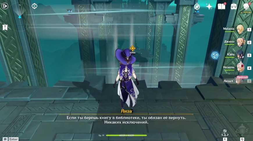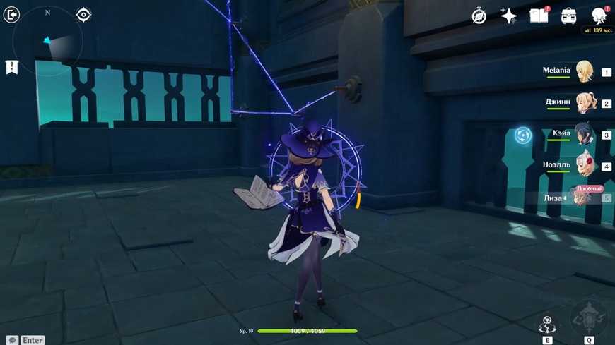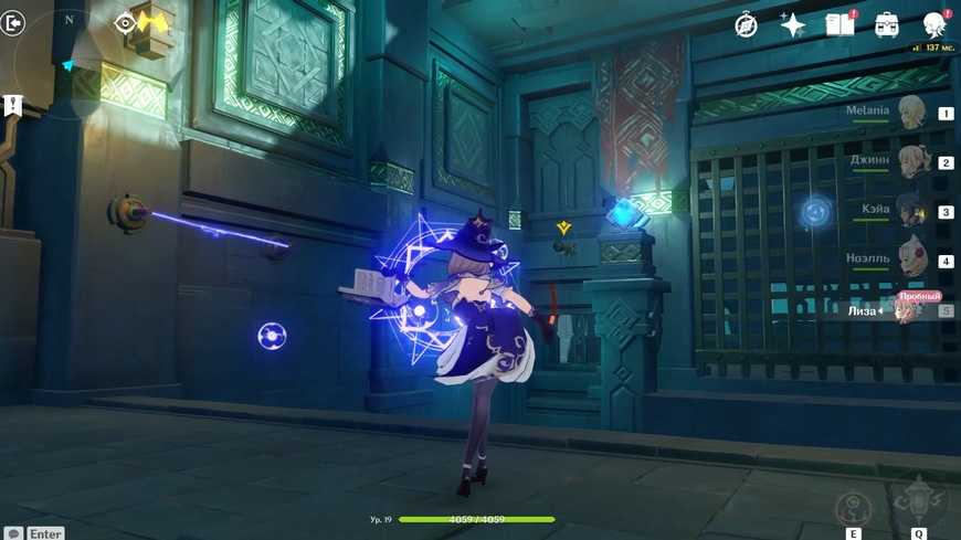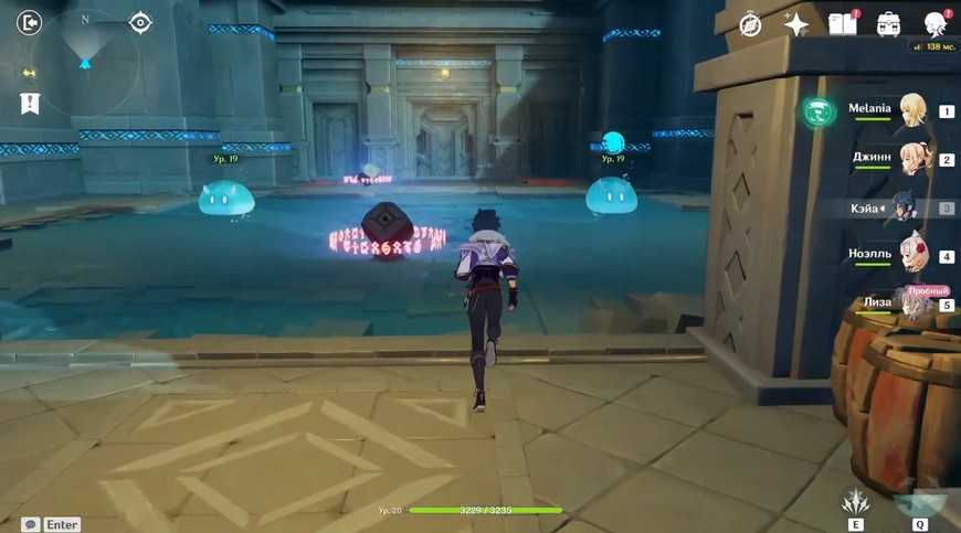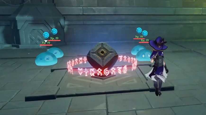 Куб в следующей комнате активируется только через победу над врагами. Придется разобраться с четырьмя маленькими Гидро слаймами 19 уровня. Победить их не очень сложно, главное помнить, что одинаковая стихия, то есть Гидро , не будет наносить им урон. А вот Электро Лизы придется весьма кстати! Она безостановочно будет создавать на них элементальную реакцию ”Заряжен”. Впрочем, можно использовать и персонажа другой стихии или просто наносить физический урон оружием.