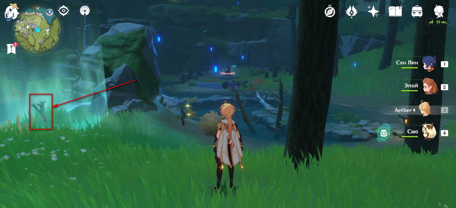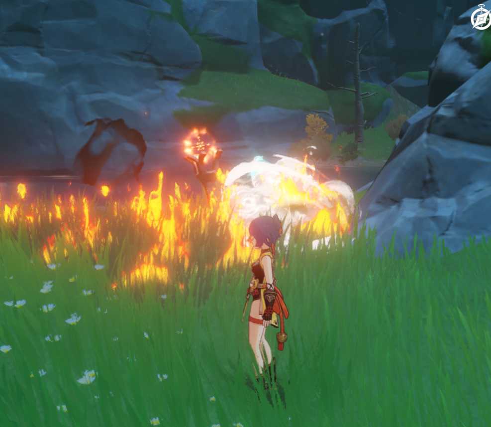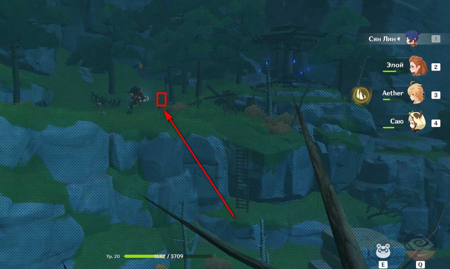 Как только взобрались на скалу – включите снова чувство стихий . След опять-таки окажется слева от Персонажа рядом с мини-лагерем хиличурлов.