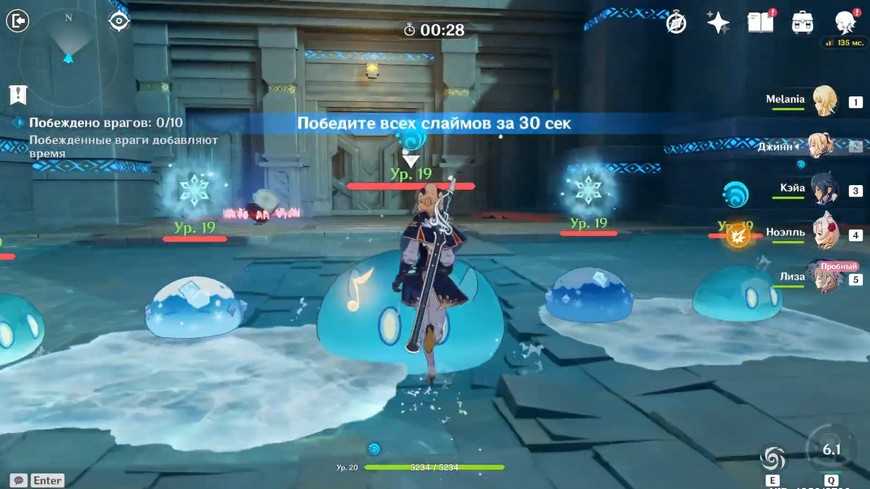 Как только разберетесь с первой пачкой слаймов – активируйте куб в центре комнаты. Начнётся испытание на время, в течение которого нужно будет победить 10 врагов – на этот раз не только Гидро , но и Крио слаймов – за 30 секунд. Каждый побежденный слайм добавляет ко времени + 3 секунды.