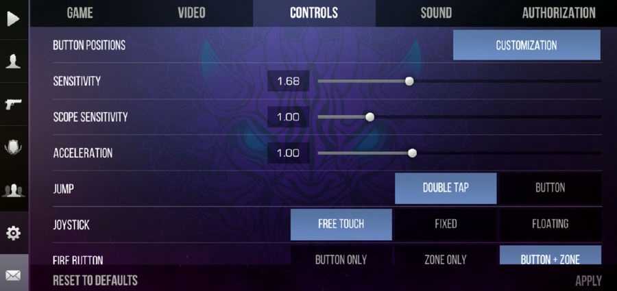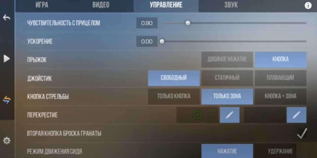 Вкладка «Чувствительность». Не забудьте выключить ускорение. Опытным игрокам рекомендуется не играть с ускорением, оно мешает игре, и ваш персонаж может повести себя странно в любой момент. Не забудьте включить вторую кнопку броска гранаты, это очень полезная функция. Мы также рекомендуем включить кнопку прыжка. Расположение кнопок на экране зависит от вашего стиля игры. Здесь нужно выбрать съемку слева или справа, от этого будет зависеть положение камеры (см. раздел «Геометрия карты»).