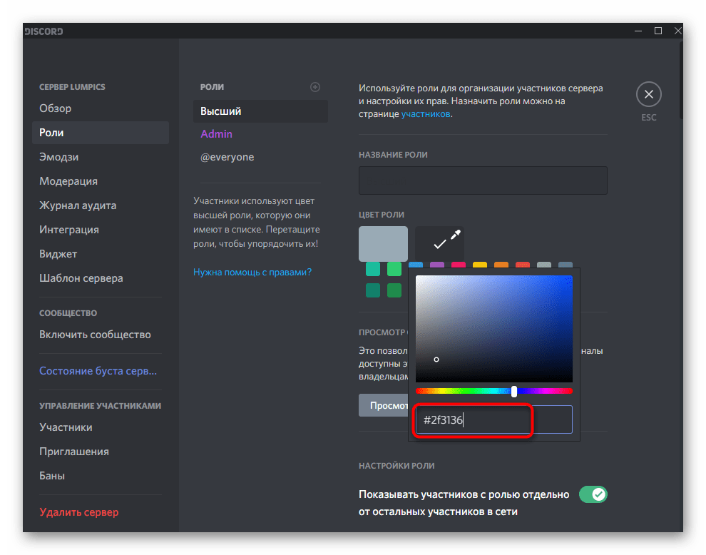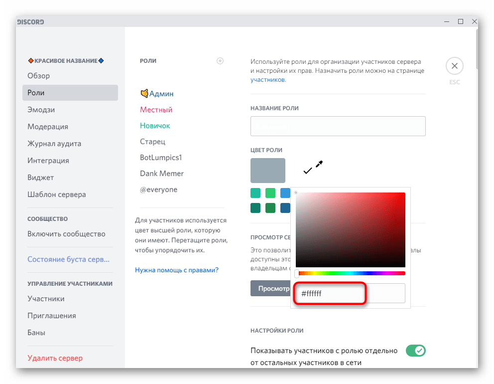 При использовании светлой темы все эти настройки теряют актуальность, поэтому необходимо внести другие изменения. Задайте цвет роли полностью белый (), если хотите, чтобы его не было видно в чате при отправке сообщений.