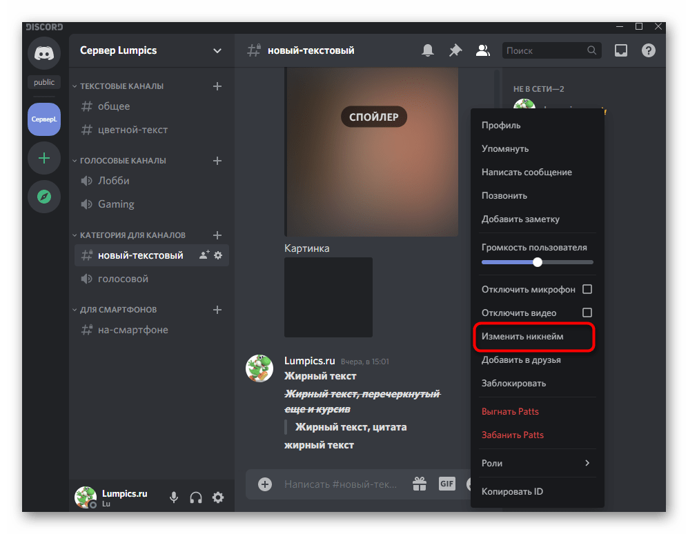 - Перейдите на сервер, где хотите поменять ник, или откройте настройки профиля для изменения имени учетной записи. Найдите себя в списке участников и кликните правой кнопкой мыши для появления контекстного меню.
