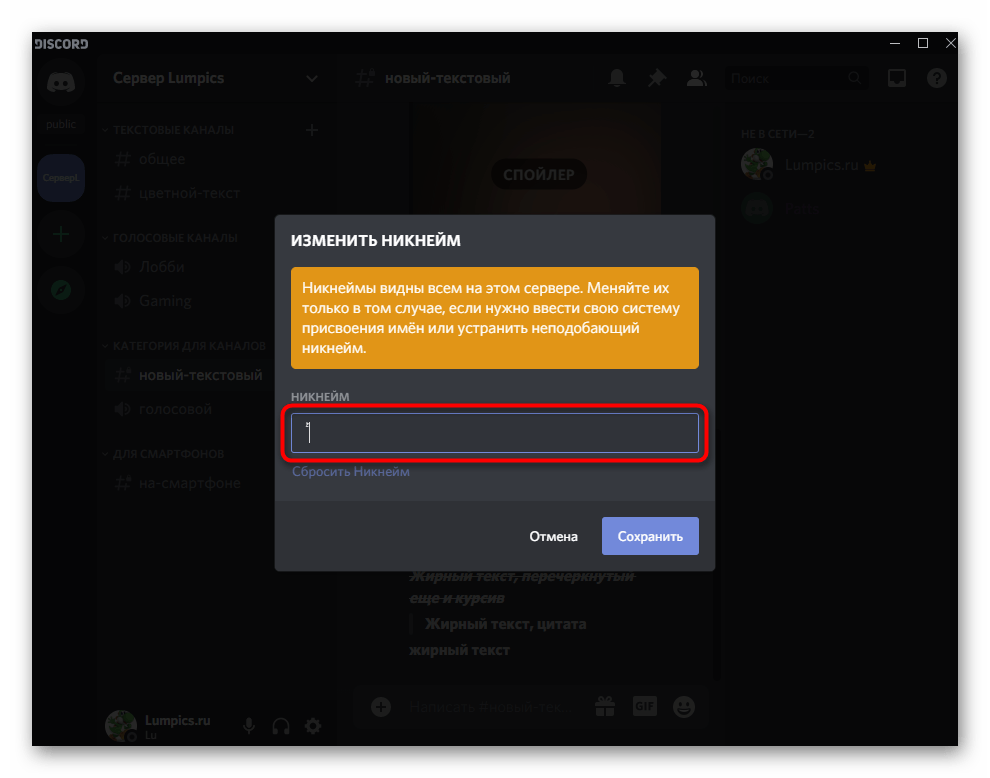 Если вы используете версию Дискорда хотя бы годичной давности и не собираетесь обновляться, у вас есть возможность редактирования ника путем добавления пробела вместо других символов. Следовательно, такое имя сохранится, поскольку поле не является пустым, но отображаться ничего не будет. Соответствующие коррективы вносятся следующим образом: